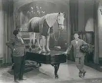are talking about a famous painting. Trying to collect the reward, they take the horse to the mansion of the owner of the painting, arriving as he is getting out of the shower. Without looking at what Stan and Ollie have brought in, the owner tells them to put it on top of the grand piano. Stan does not understand, but Ollie tells him that rich people are “just the reverse” from everybody else. Stan and Ollie have quite a struggle to get the horse on top of the grand piano! Find out more at laurel-and-hardy-blog.com With live piano accompaniment from Neil Brand. Hippodrome Cinema, Bo’Ness Link