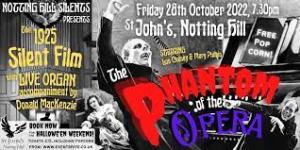 benchmark in the American silent film era. The film was a critical and commercial success upon release, and still stands as an important film in cinematic history to this day, with press quotes from the time labelling the film an ‘ultra-fantastic melodrama’ (New York Times), ‘produced on a stupendous scale’ (Moving Picture World) and ‘probably the greatest inducement to nightmare that has yet been screened’ (Variety). The mysterious phantom (Lon Chaney) is a vengeful composer living in the catacombs under the Paris Opera House, determined to promote the career of the singer he loves (Mary Philbin). Famed for the phantom’s shock unmasking, incredible set designs and the masked ball sequence, it still packs a punch. Find out more at wikipedia.org. With live organ accompaniment by Donald MacKenzie (and free popcorn, what is there not to like!) St John’s Notting Hill London W11 Link