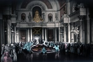 Helped by another traveler, Senor Dupont, royal dressmaker to Catherine, wife of Emperor Peter III of Russia, Casanova steals Dupont’s identity and money and proceeds on to Russia. Along the way he briefly meets and is infatuated by Marie (image, right), wife of Count Mari. In St Petersburg Casanova (still in the guise of Dupont) makes the acquaintance of Catherine and is appalled at the deranged Emperor’s humiliation of her before his repulsive mistress. Casanova also renews his acquaintance with Count Orloff who he has previously befriended in Venice. Orloff is determined to unseat Peter III and put Catherine on the throne. Following a palace coup, Peter is killed and Catherine crowned Empress. At a grand ball to celebrate her
