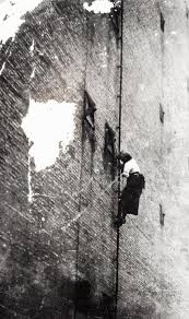 climbing down its moving sails, climbing down assorted multi-storey buildings and chimney stacks, hanging from the wheels of an aircraft and, perhaps most impressively, parachuting from an aircraft onto the spire of a church which she then climbs down. Sadly there is quite a bit of nitrate damage on the film but this does little to detract from Sannom’s breathtaking stunts, all undertaken with what looked to be the scantest attention to ‘health and safety’. No safety wires here or nets to catch her if she falls, one slip meant death.