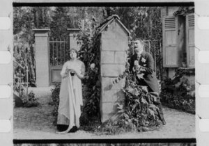 After a short interval where we could but reminisce about stocking up with coffee, tiffin or caramel shortbread from the Cinema Museum’s snack bar we were back for Michelle’s next introductions. The first was for Over The Back Fence (1913), made in the US by the Edison Company and again held by the Eye Film Museum. In the film, the old Colonel (William Wadsworth) and his neighbour Miss Scraggs (Alice Washburn) are not on good terms after a fight between their respective pets. This is unfortunate as the Colonel’s nephew ( Harry Beaumont) and Miss Scraggs’ niece (Bessie Learn) are on