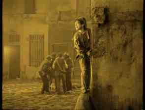 Thenardier loots the bodies of the dead, resembling more a carefully composed oil painting than a film set, it’s a beautiful mix of live action foreground and painted backdrop (right), perfectly capturing the scale of the slaughter. And while much of the film takes place at an intimate level, in scenes which Fescourt handles superbly, he is equally adept at handling the more dramatic and larger scale moments such as the ballroom scene or the street-fighting on the barricades.