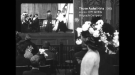 In a subsequent discussion about the film, host for the evening Amran Vance pointed out that the film the cinema-goers had been trying to watch, and which had been crudely matted in, was not originally part of the film. In the original, the cinema screen had apparently been blank. The film-within-a-film was probably A Corner of Wheat, also directed by Griffith in 1909 but not made until after Those Awful Hats had been released. It remained a mystery as to when the image had been added to the print….and by whom?