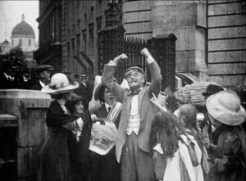arrest him. But a passing band of suffragettes, mistaking him for a kindred spirit, set him free (image, right). Returning home disheveled he is about to pour a drink when another ‘Votes for Women’ sign left by his maid unfurls from the drinks cabinet.